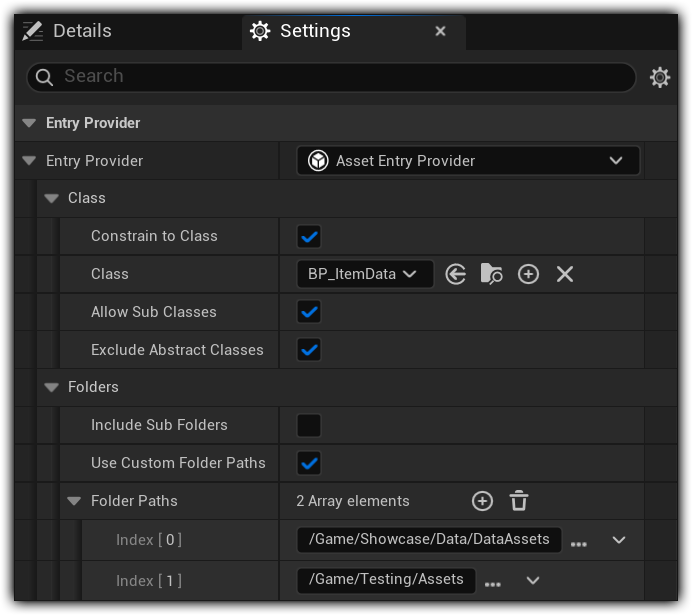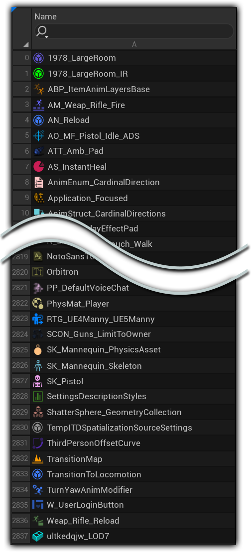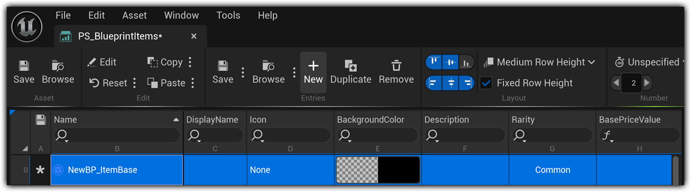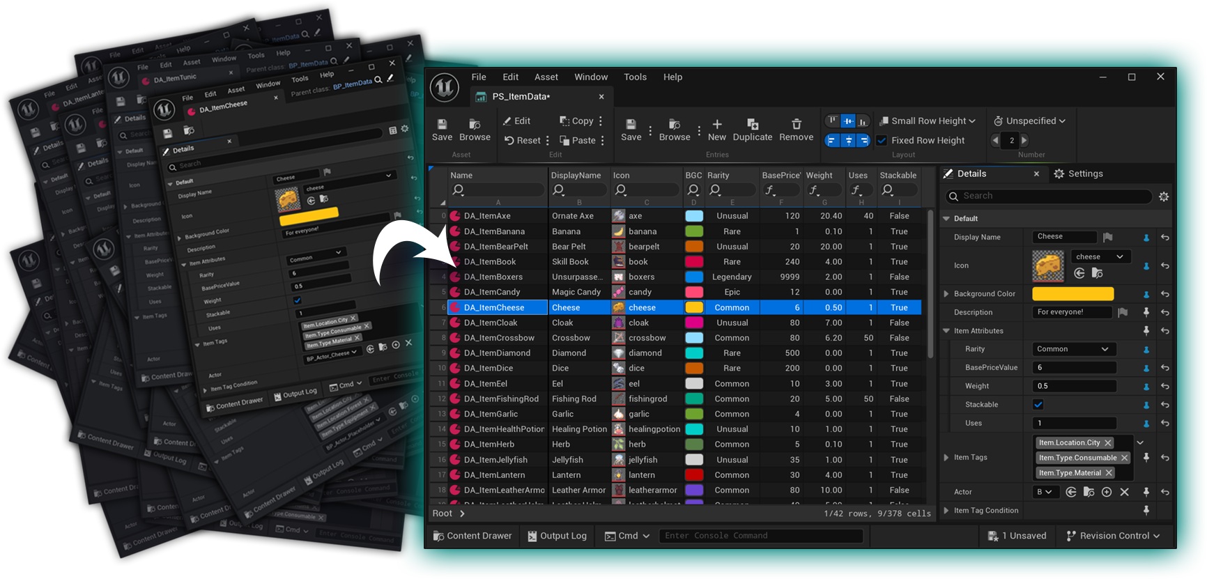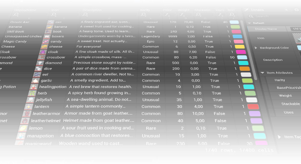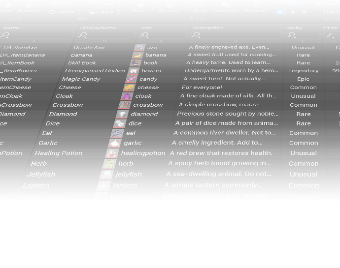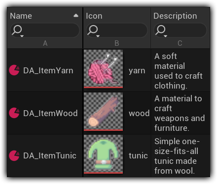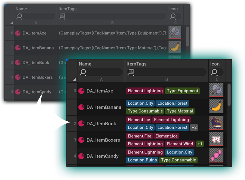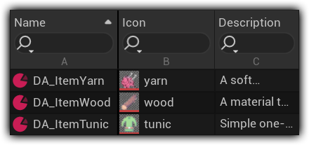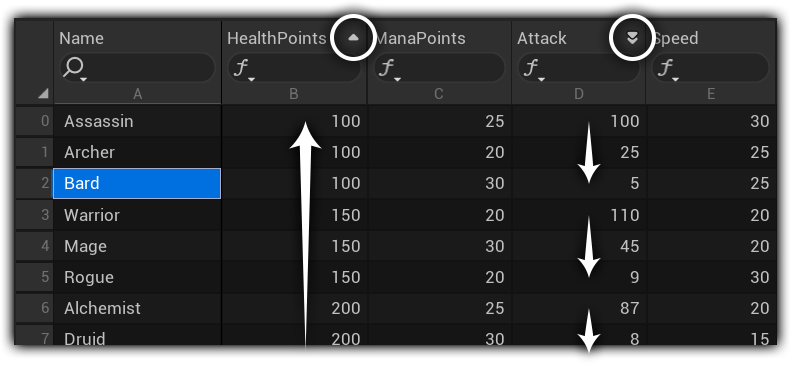 Filter rows by each column separately, either by string or by using specialized filters (regex, numeric expressions, Gameplay Tag queries).
